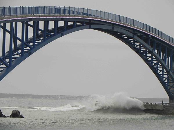 因為受到颱風的影響,海浪沖刷岸邊激起的浪花很高喔。