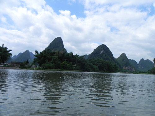 坐在船上觀看荔江兩岸群山,山水相連景色秀麗。