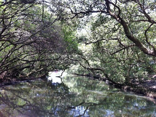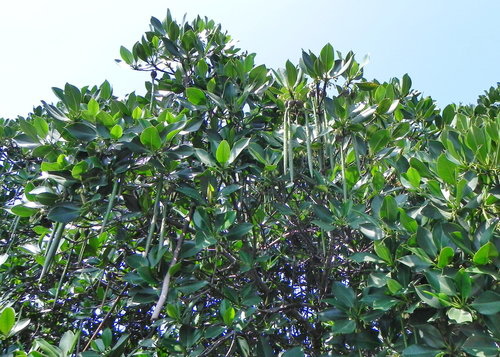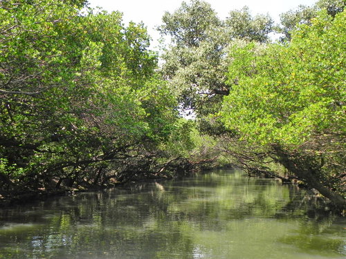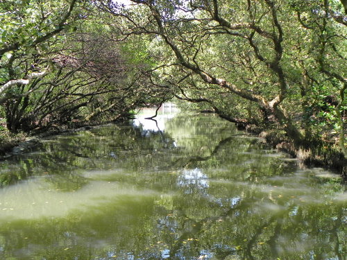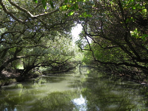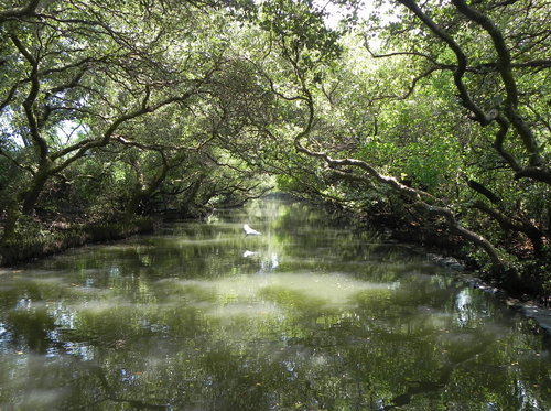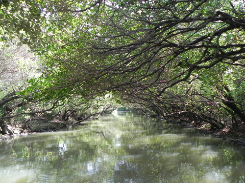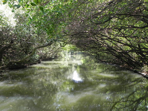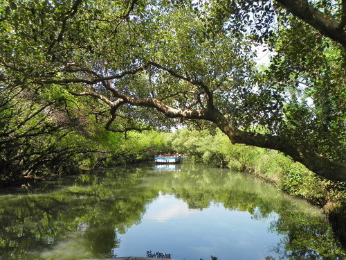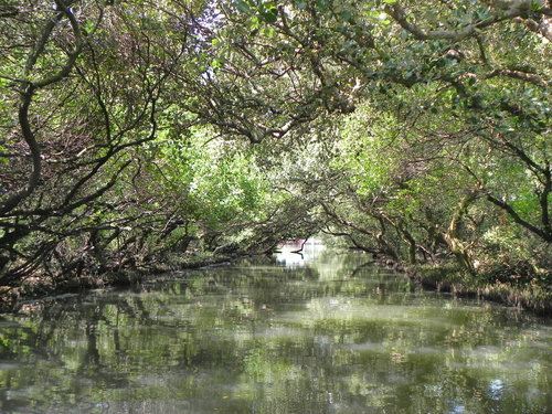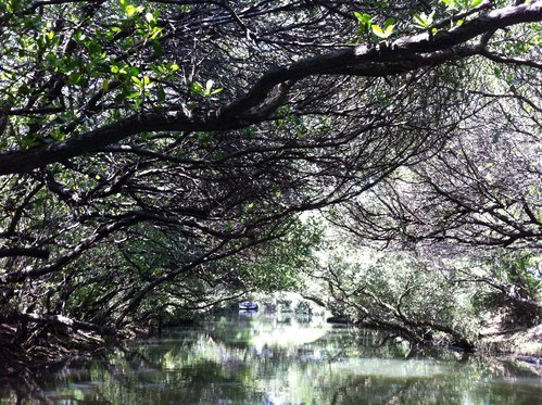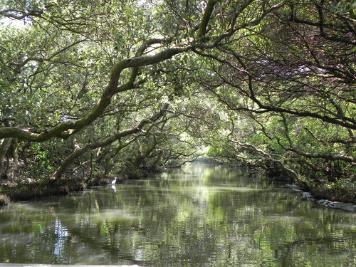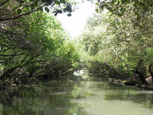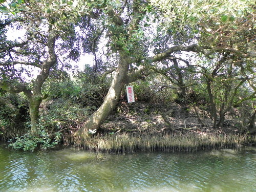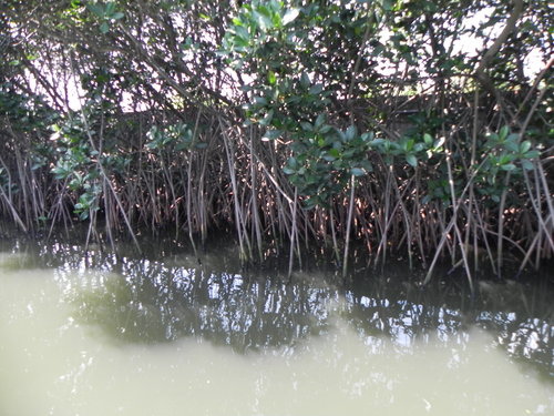 台灣目前的紅樹林種好像有4個品種,而台江四草的水上綠色隧道不到兩百公尺的兩側水道旁,就分佈著三種紅樹林植物:數量最多的是海茄苳,其次為最耐鹽的欖李,以及少數的五梨跤(四草濕地生態介紹的網站介紹的很詳細,有興趣請參考)。
