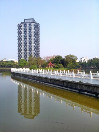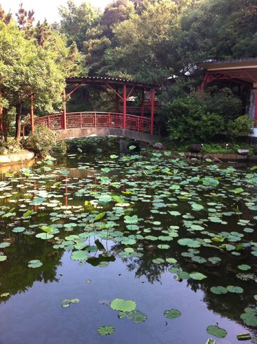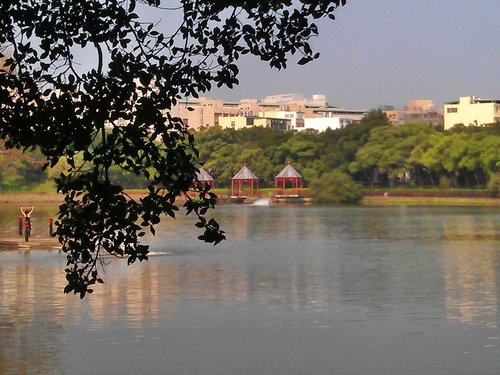 中國古典樓閣與荷(蓮)花池隱身於湖畔,可惜現在沒有花,不然會更美。