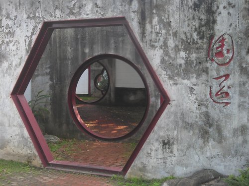 公園入口的門框是明顯的鋼樑結構,現代建築材料的剛硬詮釋著中國式古代拱門的意象,多樣性變化的園門,讓人行走其間,產生各種換景的視覺效果。