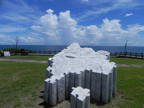 來到另一邊的休憩區發現一個漂流木的創作,旁邊有不少陸客正在休息,原來旁邊才是觀察石雨傘的最佳位置。