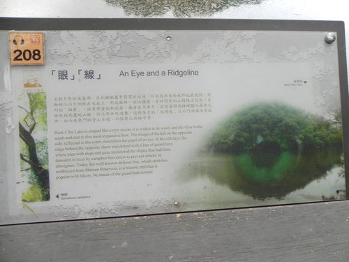 這個特別放進來的解說牌是<眼><線>,呈新月形的後慈湖,在此最寬處小山丘雨水中的倒影會形成出一個如眼眸般的圖樣。