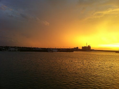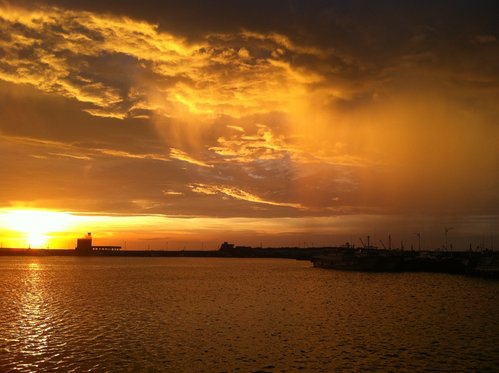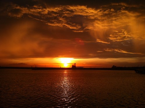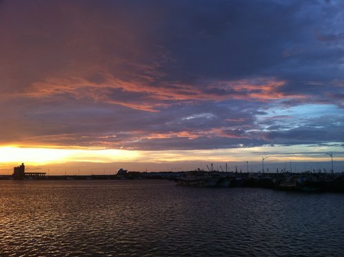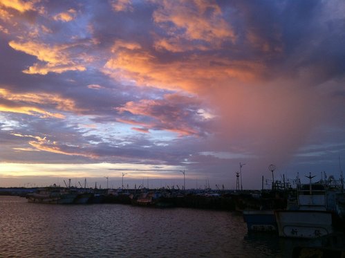 今天遠遠的看見新竹南寮方向天空十分特殊,一大片的霧狀雲襯托著藍天加上即將出線的落日異常美麗,趕快調轉車頭往漁港前進,沒帶相機沒關係,2支手機一起來搶拍。