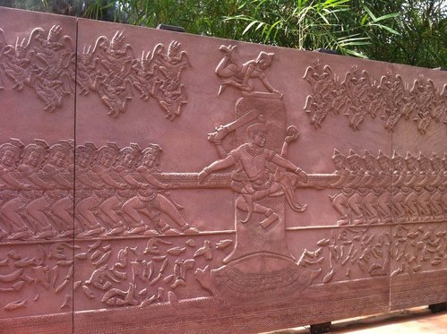 很多地方都可以看到這幅石雕,這是敘述2個神明戰爭不止,最後改用拔河決定勝負,而這條繩索則是眼鏡蛇所取代的。