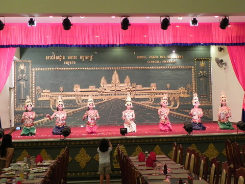 一進來已經在表演柬埔寨民族舞蹈之DINNER SHOW,在豪華的表演舞台,上演一齣齣古老神話的傳說,藉由舞蹈的肢體語言訴說著民俗的傳說與美麗的神話故事,這是七仙女的故事,不是我們牛郎與織女的那個七仙女ㄛ。
