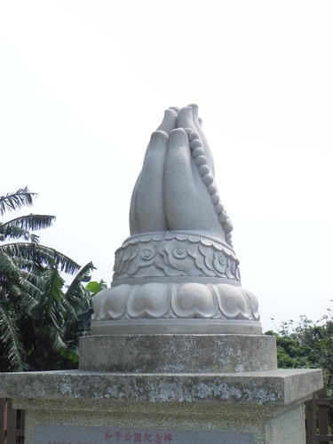 依照指示來到這裡,首先看到的是這個大佛手,原來這裡是淡水的和平公園,而一滴水紀念館則是座落在其中。
