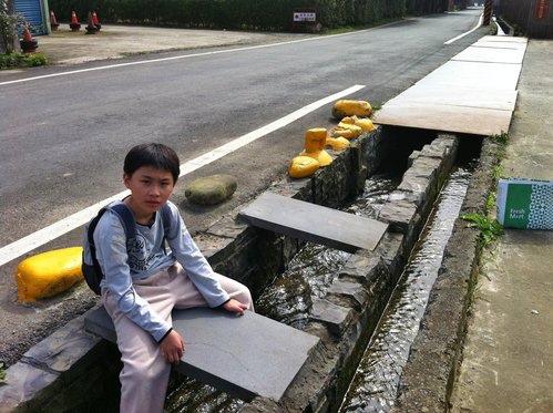 小朋友坐在石板上,這不是水溝ㄛ~而是古早的洗衣坑,水道設計成一大一小,一高一低讓婦女們方便洗衣。