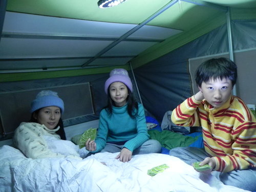 睡覺前照例還要玩個撲克牌,這次準備齊全,帽子,口罩,羽毛被.....保證溫暖一整晚。