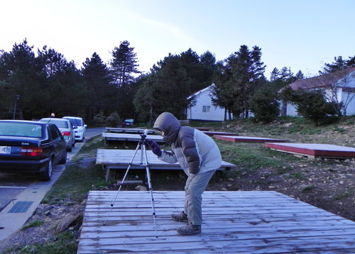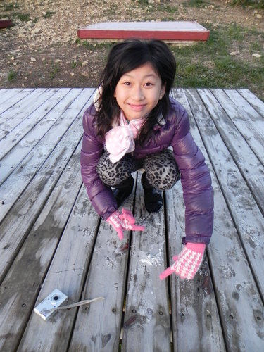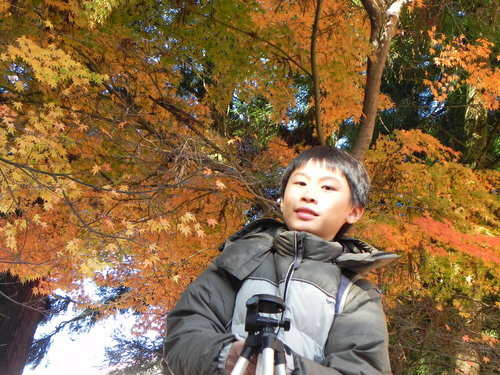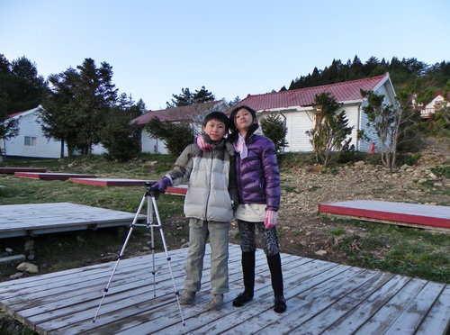小朋友不畏寒冷在旁邊把腳架裝好準備取景了。