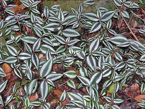 科別:鴨跖草科英文名稱:Zebrina pendula別稱:吊竹草、雞舌草、紫露草、帽子花、藍姑草、耳環草花期:夏季型態:原產地墨西哥,目前已馴化成野生狀態。吊竹草莖呈蔓性,能匍匐地面生長,莖節易發根。葉長卵形,互生,葉端銳尖。葉面平滑,銀灰色,有金屬般光澤,中肋、葉緣、葉青紫紅色,成株開花紫紅色三瓣。大吊竹草葉呈闊卵形,葉密生,葉面紫褐色,在強光照射下葉色轉為紫紅,極美觀。