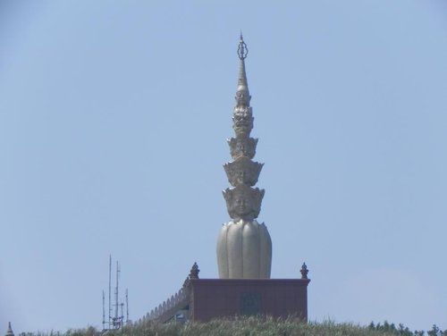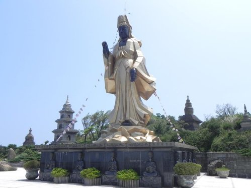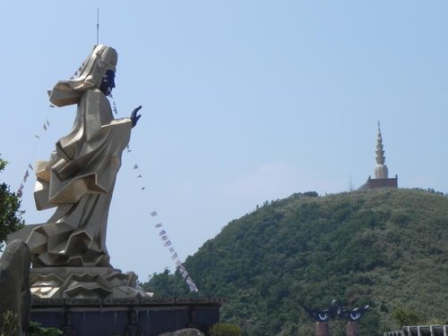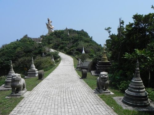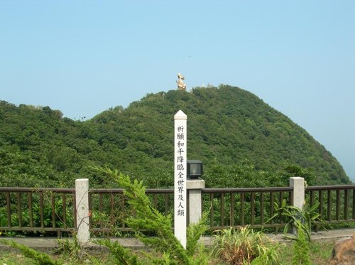 沿著步道可以看見前方一尊高12公尺醒目的青銅鑄造的黑面金身觀音;兩側山坡則是有總計53座的佛塔稱為「舍利塔林」。
