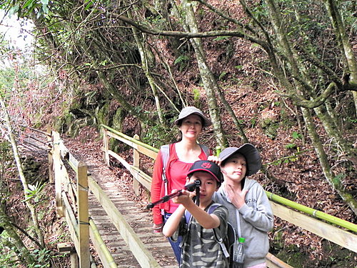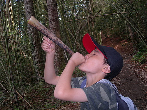 結束這趟巨木群健行,小朋友表演一個絕技-吞劍,事後他更正這是在吹號角。