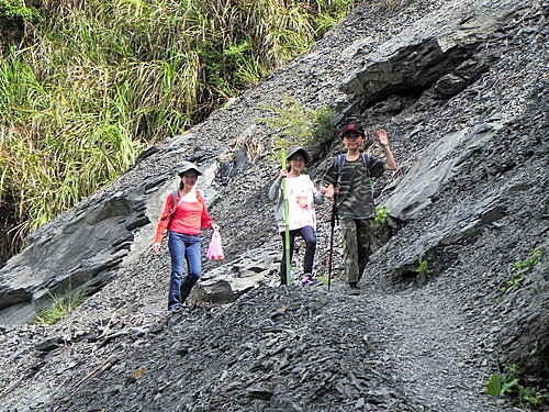 進入碎石坡了,昨天導覽人員說部落曾經有年輕人滑下去只花約20分鐘,上來要花4小時,我們的話約要花8小時。