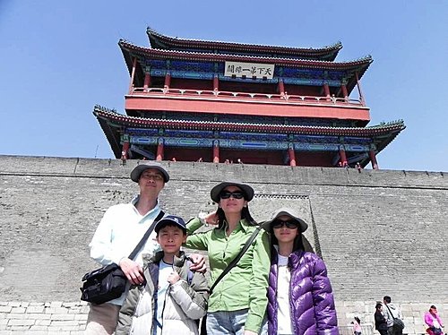 長城這裡的階梯高矮不一,用小朋友做對比,這一階幾乎到他的屁股了,難怪有許多人是走著上去,坐著下來。
