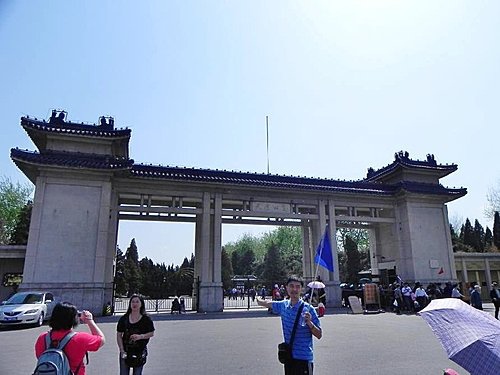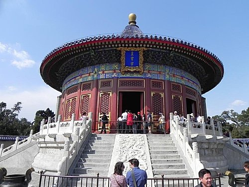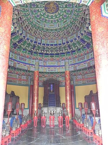 皇穹宇的背後。皇穹宇,也叫回音壁,建於明嘉靖九年(1530年)。初爲重簷圓形建築,名“泰神殿”。是圜丘壇的正殿。用於平日供奉祀天大典所供神版的殿宇。嘉靖十七年(1538年)改名爲“皇穹宇”。清乾隆十七年(1752年)改建爲今式。皇穹宇殿高19.5米 ,直徑15.6米 ,木拱結構,嚴謹、精致,上覆藍瓦金頂,精巧而莊重。殿內開花藻井爲青綠基調的金龍藻井,中心爲大金團龍圖案,是古代建築傑作。