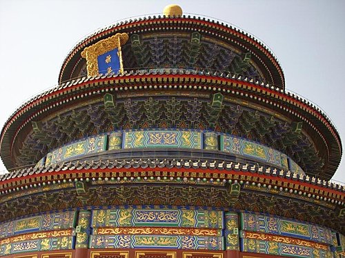 更有人把祈年殿形象演化為“北京”兩個字,作為北京電視臺的標志,成為北京的象征,已被國內外人士所認同。祈年殿以“天圓”為平面的基礎構思,在三層圓形高大的漢白玉云石臺基上,建筑一座有寶頂、三層重檐且層層收縮的圓形攢頂式大殿。通高38米 ,直徑37.72米 ,全部為木結構。