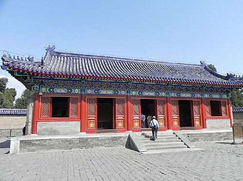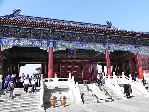 祈年門,位於祈年殿正南,是面闊五開間的大宮門,廡殿頂,上覆藍琉璃瓦,下承白石崇基.祈年門東西兩側延伸出藍瓦頂紅墻身的內墻,連接於祈年殿的東西配殿.