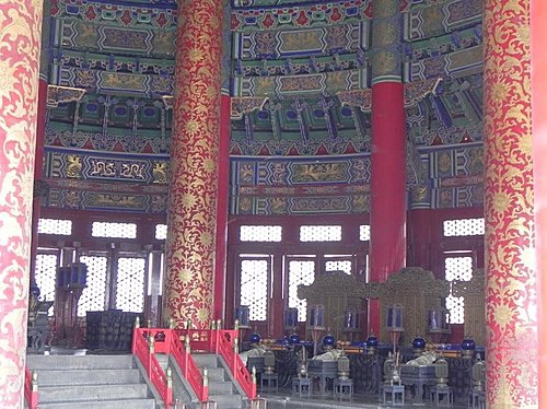 殿內的各種柱子之和分別代表一年四季,一日12個時辰,一年12月,二十四節氣,二十八星宿和三十六天罡星。充分體現了古人對“天”的認識和理解,以及“天命人從”、“天人合一”的思想。祈年殿在初始設計時,就把中華傳統文化與建筑外形、內部結構以及各類裝飾巧妙結合、融會貫通,成為中國古代木結構建筑與中華民族思想文化有機結合的經典之作。祈年殿是每年農歷正月上辛日舉行祈谷大典的場所,清代每逢大典時,殿內正面的雕龍寶座上供奉著滿漢合璧的“皇天上帝”的神版,東西兩側共設有八個配位,供奉著清朝自努爾哈赤到道光的八位皇帝,以體現古人“敬天法祖”的意識。每個神位前都設有供桌,陳放各種供品。