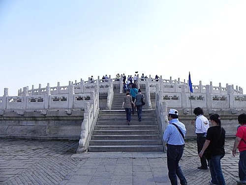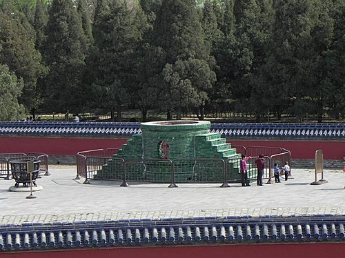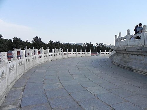 圜丘壇是祭天的地方,而中國古人一向認為「天圓地方」 ,所以就把它建成圓形。當我們站在壇中央的圓石上講話,聲音會特別洪亮,就像在代天宣諭一般。這是因為壇面十分光滑,聲波能快速向四方傳播,碰到石欄杆又立即返回,與原聲匯合產生共鳴,因此聲音聽來就格外響亮了!