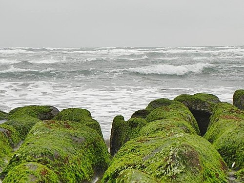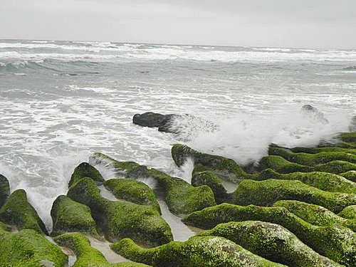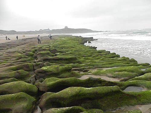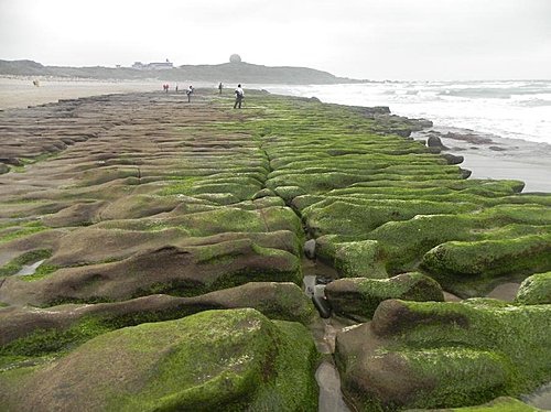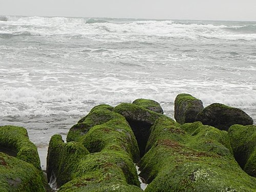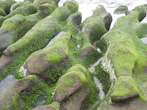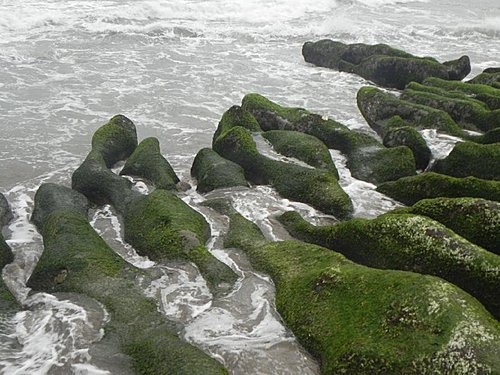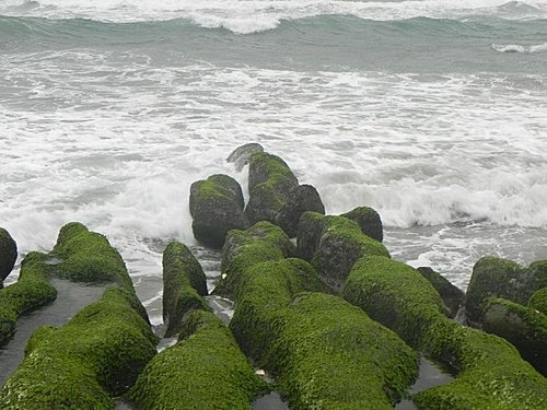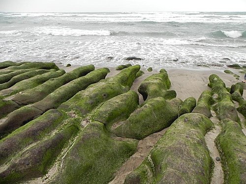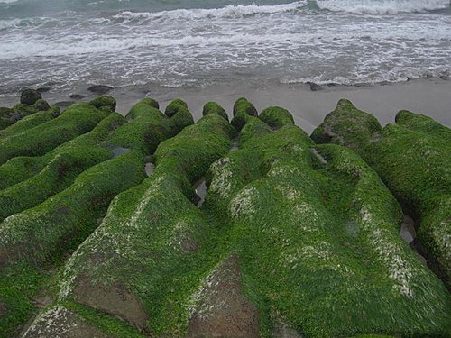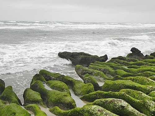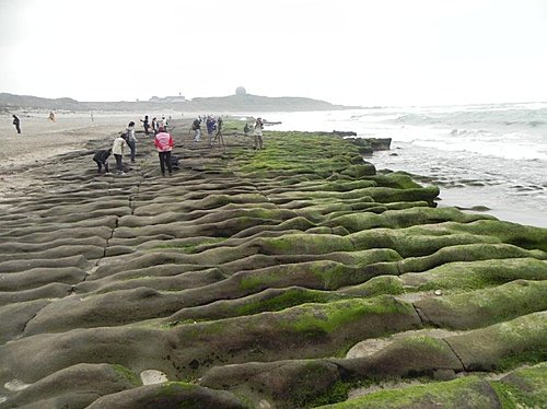 每年春季2月中旬至4月上旬,條狀石槽搭配綠意盎然海髮絲,吸引了無數攝影愛好者駐足拍攝,歷經過千萬年的演變而形成了特殊的海岸景觀,搭配夕陽更美喔。雖然今天天氣狀況不佳,但還是有許多人在拍照,我是拍一張照片鏡頭就要擦拭一次,沒辦法~~~為了留住美景,拼了~~~下次天氣好時可以再來看看