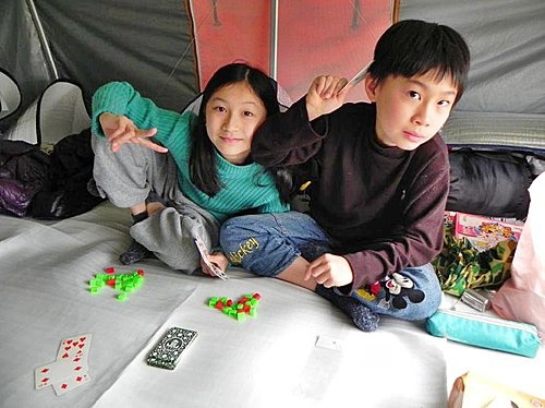 下雨時就在帳篷裡玩起大富翁, 撲克牌, 象棋.....