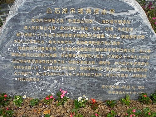 設立在碧山巖旁的白石湖吊橋,全長116公尺,卻沒有一般吊橋兩端聳立的高塔與兩側直立分布的纜線,豐富視野景觀之餘,橋面兩端的階梯與整座橋「直路式」的步道設計,像極了南投的竹山天梯。