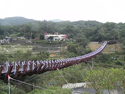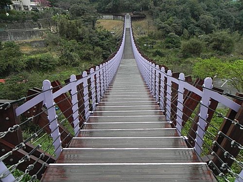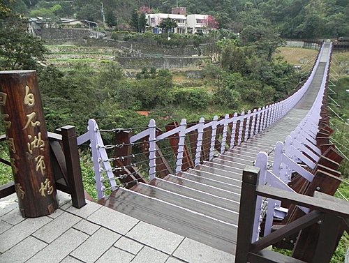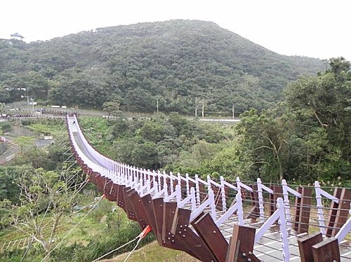 台北白石湖吊橋,橫跨內湖的忠勇山與大崙頭山系間,不僅是北市第一座大跨距吊橋,極具特色的龍骨造型,讓這座吊橋宛如一座飛龍騰越山谷。