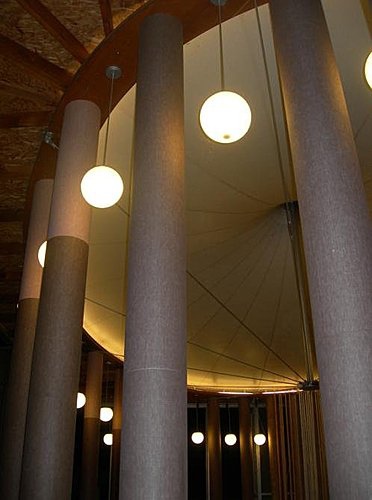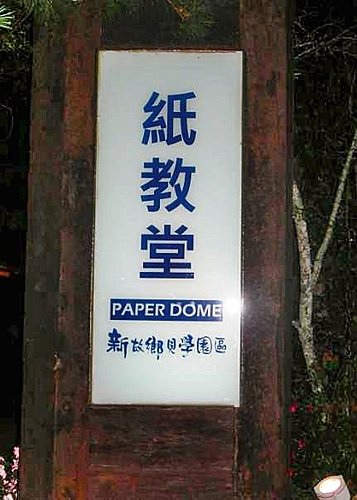 網路上說~~~這座居民暱稱為Paper Dome的紙教堂,是以成本較低的玻璃纖維浪板構築成長方形的外牆,內部則用五十八根紙管(長度5m、直徑33cm、厚度15mm)建構出一個可容納八十個座位的橢圓形空間。坂茂利用紙管構成的橢圓形與外牆之間的空間形成一個迴廊,屋頂則覆蓋以透光的天幕,當光線由屋頂射下,形成一種莊嚴與神聖的氛圍。這座紙建築設計的原始目的,是作為社區的集會中心,但禮拜天亦兼作教會的彌撒場地。