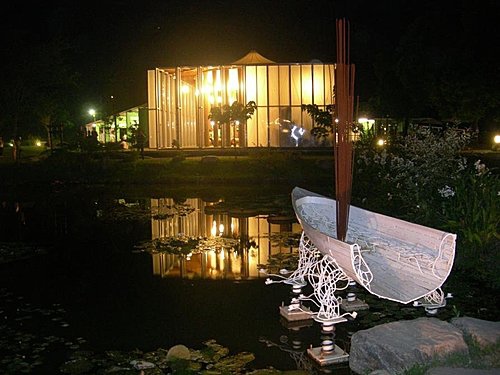 紙教堂落在青綠的草坪上,進到紙教堂內共有五十八根紙管支撐起整個教堂,室內與室外的長管椅也都是用紙製作的,教堂裡使用溫暖的黃色燈系,給人一種溫暖的感覺。