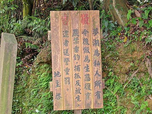這裡居然是私人的,查了一下資料,夢湖為人工湖,由地主的祖先請怪手所挖的湖,原本只是自家純欣賞用,但很多人覺得那麼美好的地方應該是要和大家分享,所以後來才請汐止鎮公所來規劃步道請大家免費來欣賞湖觀美景。未來將做復育生態用的夢湖,湖中有台灣蓋斑鬥魚、細扁魚、大肚魚,水中植物為台灣荸薺、可捕蚊子幼蟲孑孑的黃花狸藻,每年4~5月晚更可以觀賞螢火蟲。