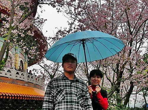 真正賞櫻花的地方是這裡,因為下雨的關係,不見人頭竄動只見傘花朵朵,盡量避開雨傘來取景。