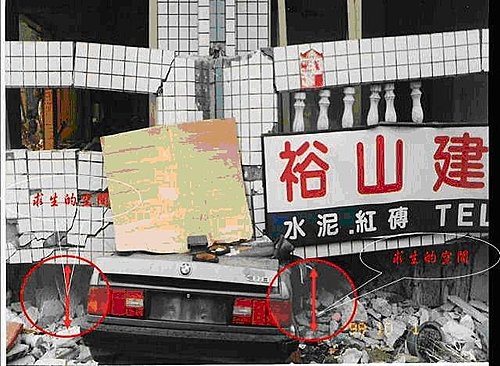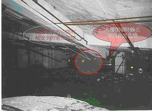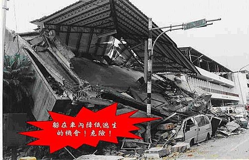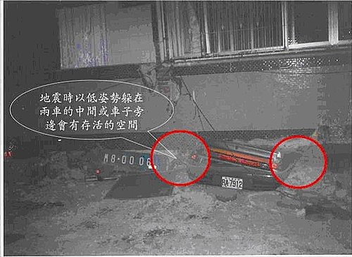 道格說,即使開車時遇到地震,也要趕快離開車子,很多地震時在停車場喪命的人,都 是在車內被活活壓死,在兩車之間的人,卻毫髮未傷 ( 此段話引圖片說明 ):強烈地震發生時,如果你正在停車場,千萬不要留在車內,以免垮下來的天花板壓扁汽車,造成傷害;應該以臥姿躲在車旁,掉落的天花壓在車上,不致直接撞擊人身,可能形成一塊『生存空間』,增加存活機會…。