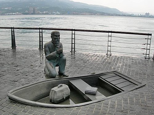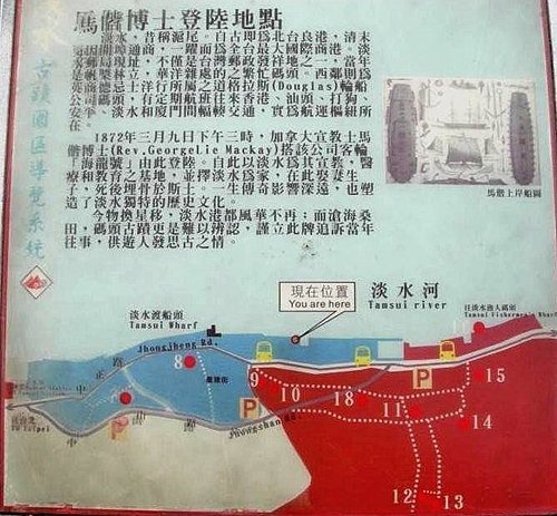 首先到的是馬偕博士登陸的地方。馬偕(George Leslie Mackay)中文名字偕叡理。是台灣北部教會的創始者。他在宣教、醫療和教育上的影響,不僅改變了淡水的文化風貌,也成了淡水歷史不可分割的一部份。