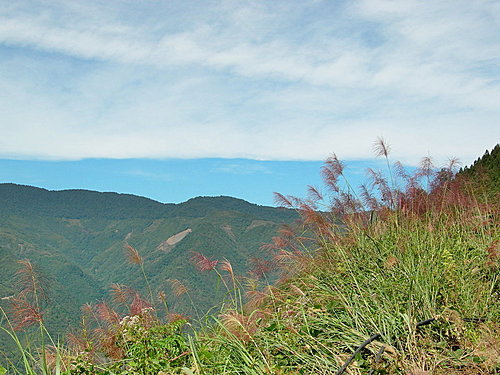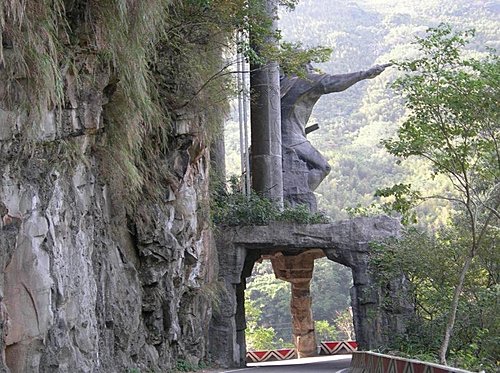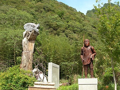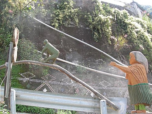 遠方是泰雅勇士雕像,位於錦屏村部落的入口處, 當地懸崖峭壁,地形險要。尖石鄉公所為推動觀光事業,再峭壁上建造一座泰雅勇士圖騰雕像,手握長矛,出征狩獵,凸顯原住民風格,由於佇立在至高點,一眼望去顯得相當宏偉。