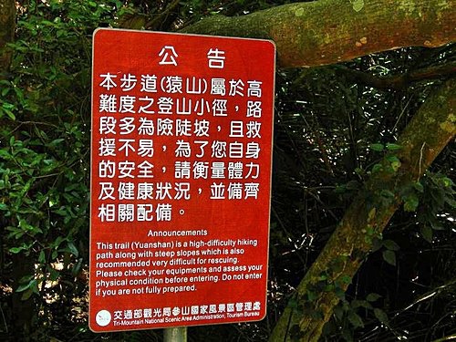 步道至此,一分而二,直行為猿山步道,可登猿山,再繞接六寮古道或越嶺通往獅頭地區。藤坪步道則取左下,繞向獅尾,接六寮古道。看到這個告示牌後讓多數人決定選擇輕鬆的下坡路。石壁就留待下次在來挑戰了。