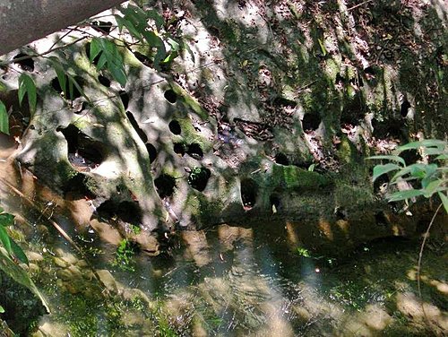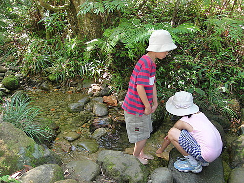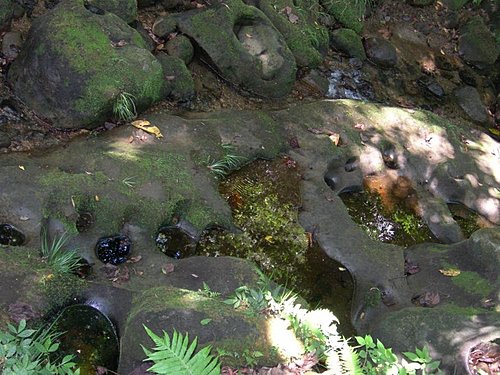 繼續出發,沿路可以發現小溪中的石頭有著一些坑洞,像及了北濱海被海水侵蝕的岩石,這就是壺穴,沒想到溪流也可以造成這種奇景。