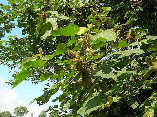○半落葉小喬木,全株密被星狀絨毛。嫩葉與芽密生紅褐色絨毛,葉互生,卵形或闊卵形,末端成尾狀,上半部有時作3淺裂,長 7 -20 公分,寬 5 -15公分,先端銳尖,基部圓形或淺心形,主脈 3 條,葉背淡黃綠色,葉表基部有蜜腺,可分泌糖蜜供螞蟻取食,而螞蟻則為它驅除蟲害,形成互利共生的關係,葉柄很長。春至夏季開花,雌雄異株,穗狀花序,頂生,雄花疏生,花被 3-4 裂,雄蕊多數,雌花排列較密,花極小而且缺乏花瓣;子房3室,花柱3-4裂。蒴果三角狀球形,外表佈滿軟刺,散佈黃褐色腺點,內有三室,各含有一顆黑色種子。