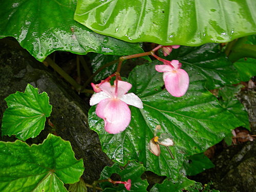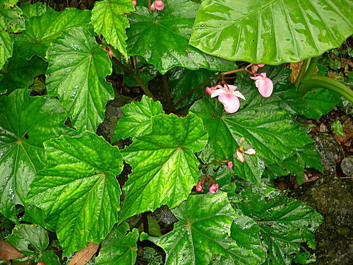 水鴨腳秋海棠雌雄異花,是台灣北部最常見的秋海棠了,它的莖 節膨大匍伏地上呈現紅色,可以不斷拓展領域。