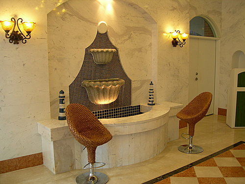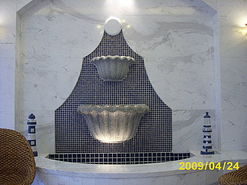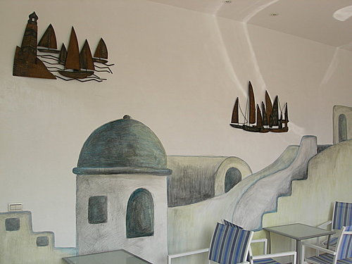 印入眼簾的是一片藍白色調的建築,濃厚的地中海風味,連週遭的住戶圍牆屋頂大部分都漆上了藍白色