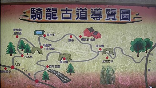 這次目標是上次未完成的「騎龍古道」,上次才走到第一座糯米橋就因為一個告示牌說道路毀損禁止前進而敗性而歸,「騎龍古道」有2個入口,相距約一百多公尺,入口2就位於「竹35」鄉道的豐鄉國小旁,這次要從另一個入口1處試試。