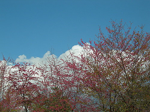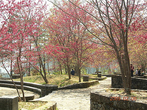再來是"玉山關山景點處",這裡櫻花一樣盛開,不少遊客在此拍照留念。