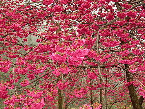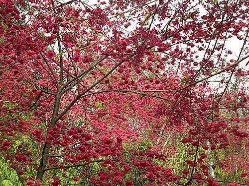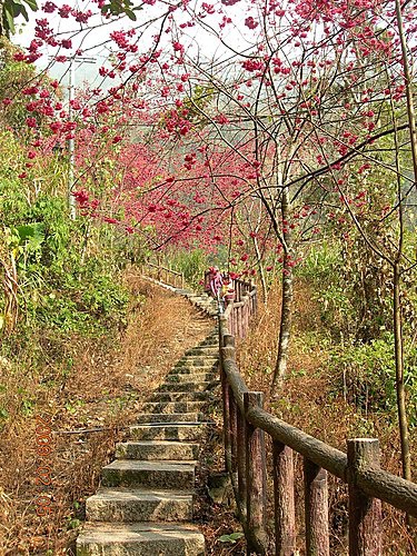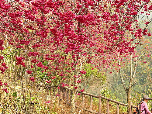 開始要進入步道了,沿路盛開的大紅色櫻花,讓人彷彿置身於花海中。