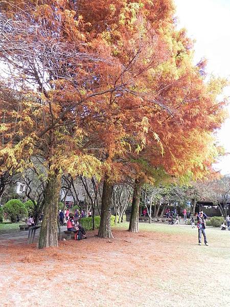 落羽松的枝葉落下,讓綠色的草皮換上新衣。