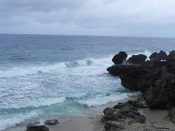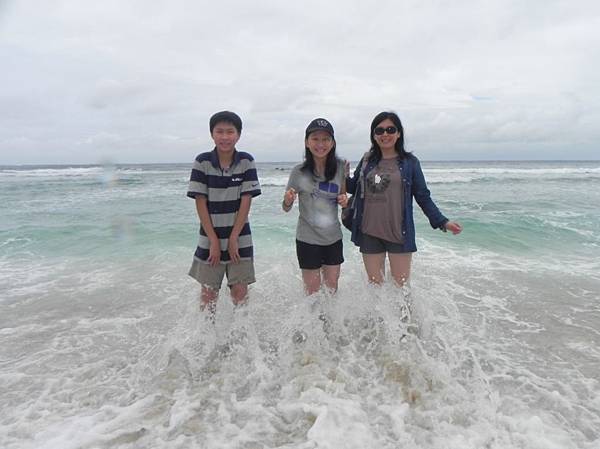 離開山豬溝後接下來的景點就是蛤板灣啦,聽到有<灣>這字眼就知道這裡可以戲水了,所以小朋友都催促快一點出發,由於小琉球是座珊瑚島,全島幾乎都是珊瑚礁岩岸地形,所以沙灘不多且小,難得的是蛤板灣居然綿延一百多公尺,而且好像是貝殼沙灘喔,這感覺真的不錯。