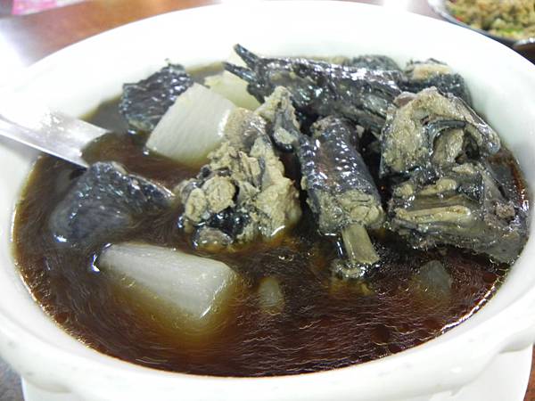 陳年老菜脯雞湯,用的是烏骨雞,吃起來還不錯。