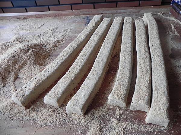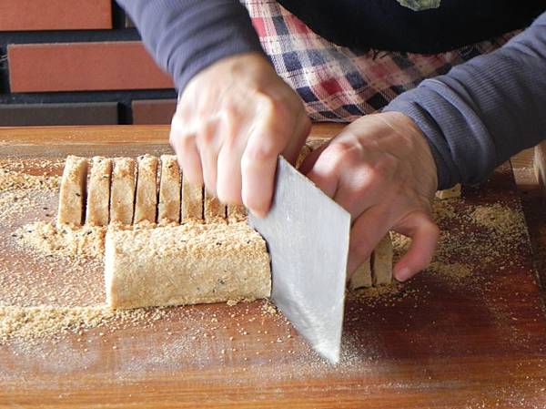 老闆將傳統麥芽手藝,經過許久的研發改良,終於打破一般傳統麥芽糖製品,舖上細緻的花生粉和芝麻,再加入晶瑩剔透的麥芽糖,經由手工的揉製,將一大片的原料,逐一地揉成長條狀,可惜沒看到老闆攪拌麥芽糖的前製程。