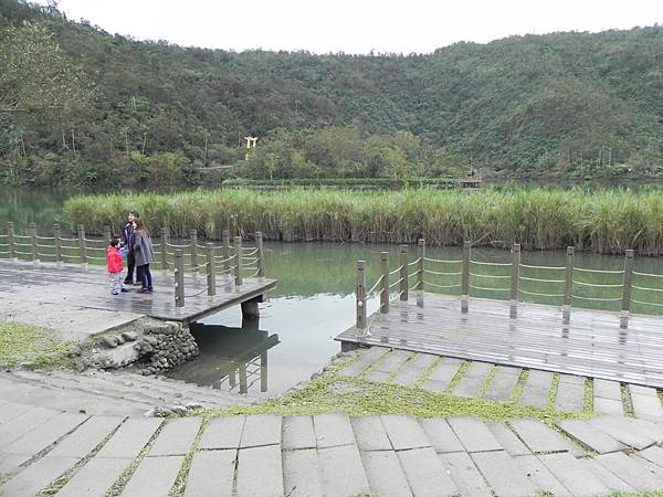 遠方有一座吊橋,銜接環湖公路及湖心的浮島,佇立島上可俯瞰整個湖面。