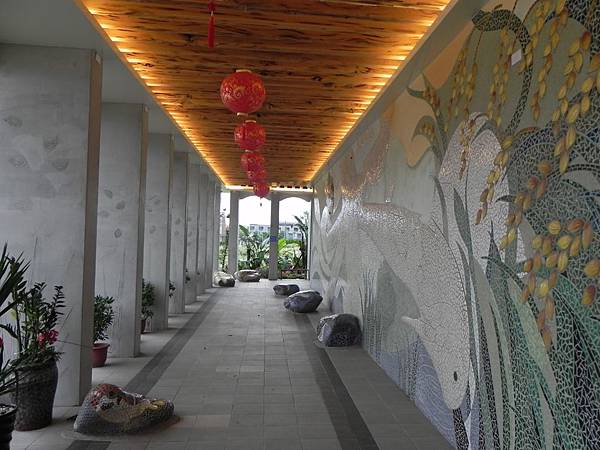 旁邊的走廊很特殊喔,右邊的牆上以馬賽克貼滿圖案,左邊的柱子上的紋路也滿美的,應該是稻草和米粒吧。
