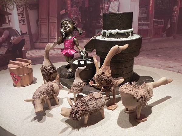 在往販賣區的牆上擺了一些與農村童趣場景的藝術品